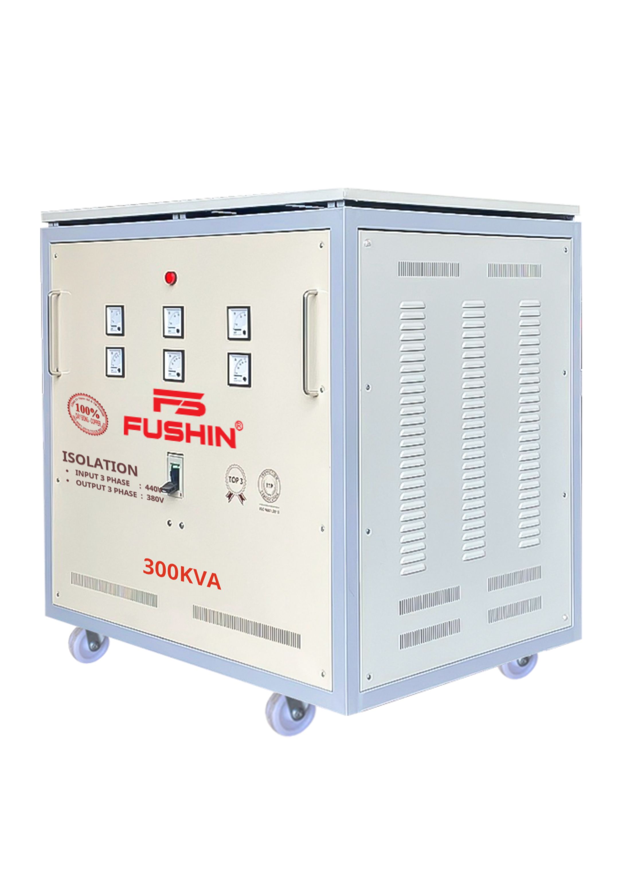 Máy biến áp 3 pha cách ly 440V/380V 300KVA Fushin Transformer Model S.II là dòng sản phẩm thế hệ mới, được sản xuất theo công nghệ hiện đại đạt tiêu chuẩn TCCS – TCVN – ISO 9001, đáp ứng nhu cầu sử dụng điện 3 pha trong công nghiệp và sản xuất với độ bền và hiệu suất vượt trội.