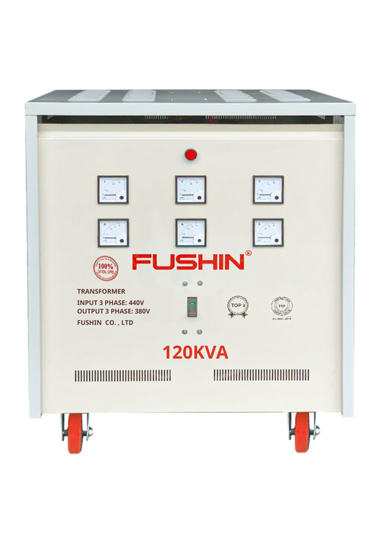 Máy biến áp 3 pha 440V/380V 120KVA Fushin Transformer Model S.II là dòng sản phẩm thế hệ mới, sử dụng 100% dây đồng, được sản xuất theo công nghệ hiện đại đạt tiêu chuẩn TCCS – TCVN – ISO 9001, đáp ứng nhu cầu sử dụng điện 3 pha trong công nghiệp và sản xuất với độ bền và hiệu suất vượt trội.