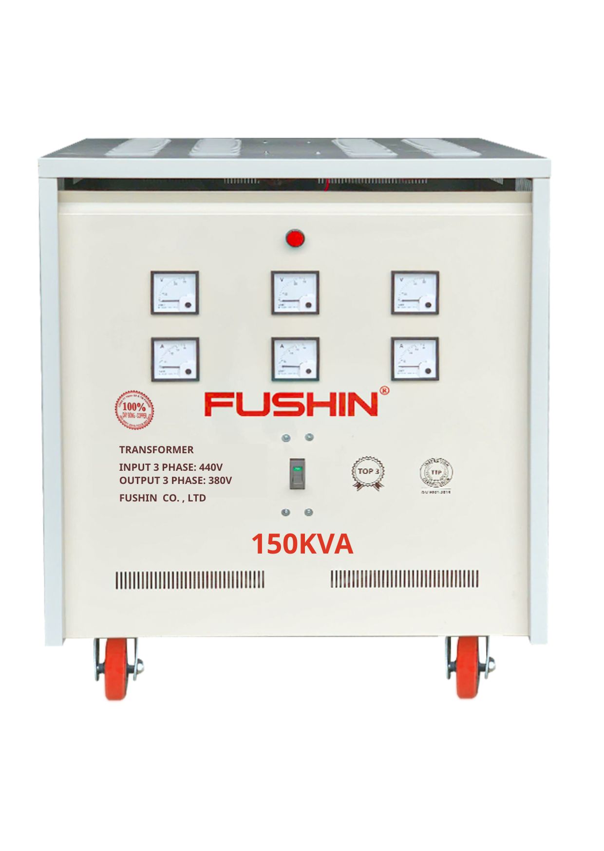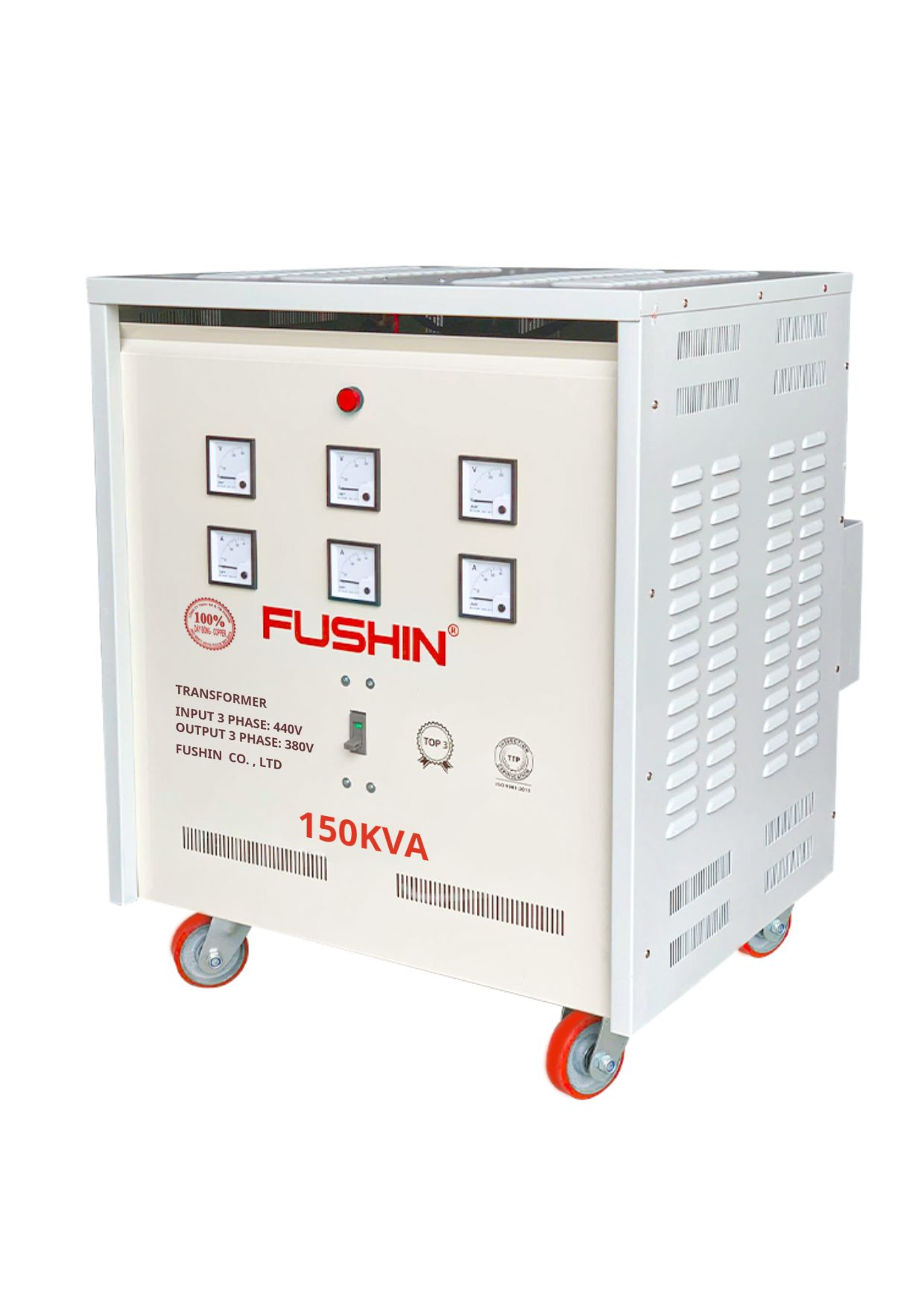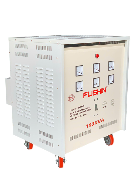Máy biến áp 3 pha 440V/380V 150KVA Fushin Transformer Model S.II là dòng sản phẩm thế hệ mới, sử dụng 100% dây đồng, được sản xuất theo công nghệ hiện đại đạt tiêu chuẩn TCCS – TCVN – ISO 9001, đáp ứng nhu cầu sử dụng điện 3 pha trong công nghiệp và sản xuất với độ bền và hiệu suất vượt trội.
