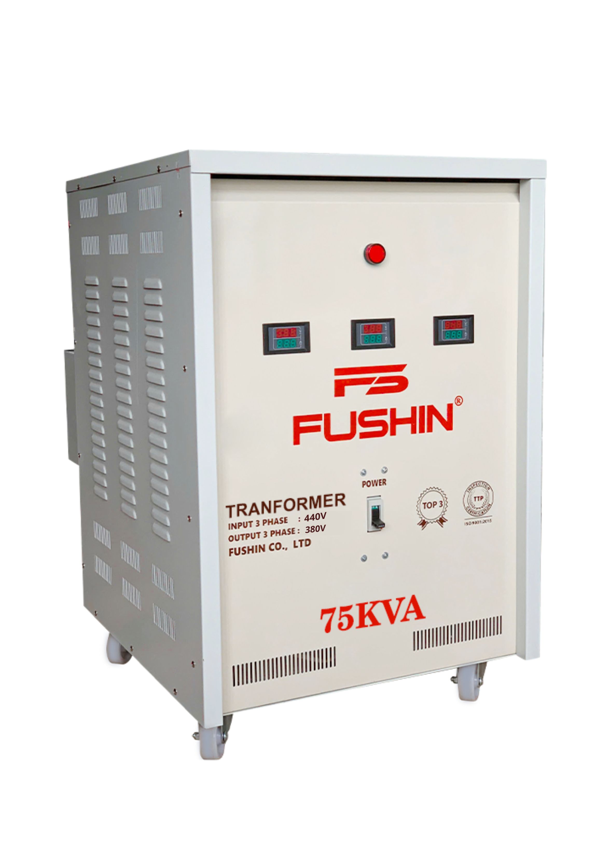 Máy biến áp 3 pha 440V/380V 75KVA Fushin Transformer Model S.II là dòng sản phẩm thế hệ mới, được sản xuất theo công nghệ hiện đại đạt tiêu chuẩn TCCS – TCVN – ISO 9001, đáp ứng nhu cầu sử dụng điện 3 pha trong công nghiệp và sản xuất với độ bền và hiệu suất vượt trội.
