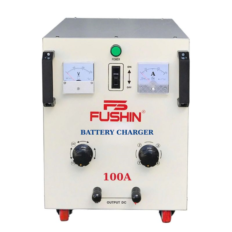 - Máy sạc bình ắc quy tăng giảm 100A Fushin được chế tạo để nạp điện cho các loại bình ắc quy khí, nước, khô. Đặc biệt là bình ắc quy của xe máy, xe nâng, xe ô tô,....