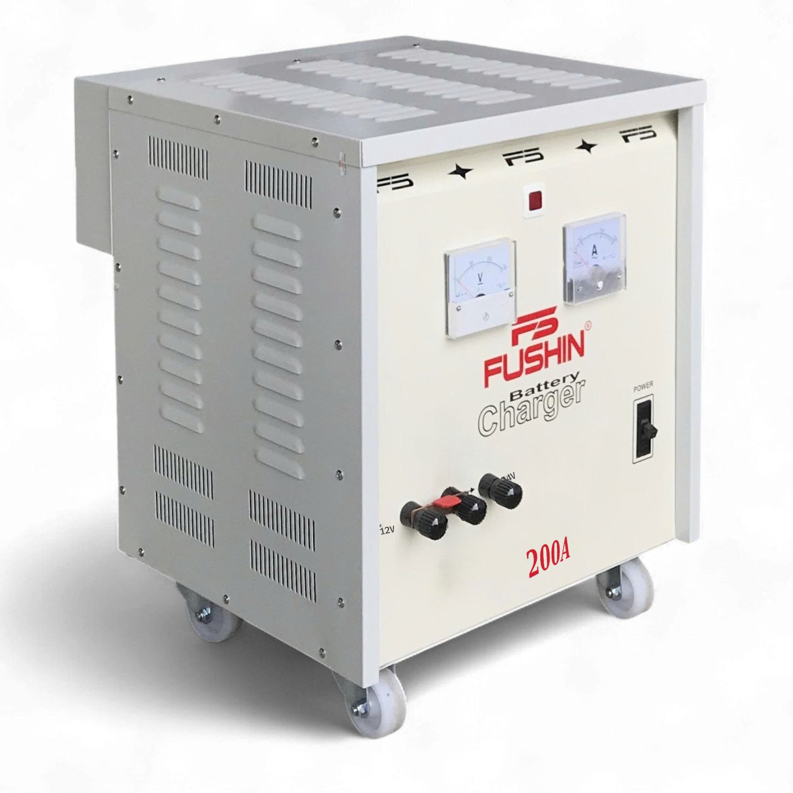 - Máy sạc bình ắc quy tăng giảm 200A Fushin được chế tạo để nạp điện cho các loại bình ắc quy khí, nước, khô. Đặc biệt là bình ắc quy của xe máy, xe nâng, xe ô tô,....