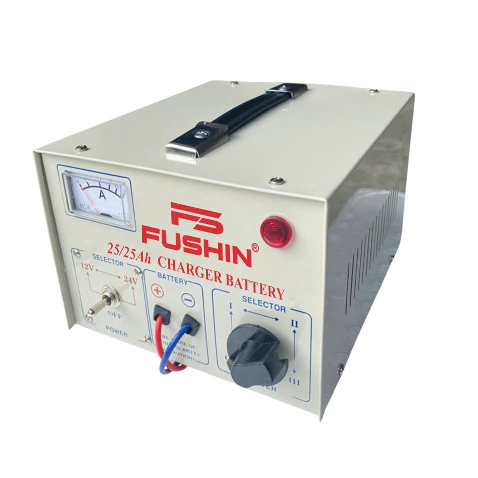 - Máy sạc bình ắc quy tăng giảm 25A Fushin được chế tạo để nạp điện cho các loại bình ắc quy khí, nước, khô. Đặc biệt là bình ắc quy của xe máy, xe nâng, xe ô tô,....