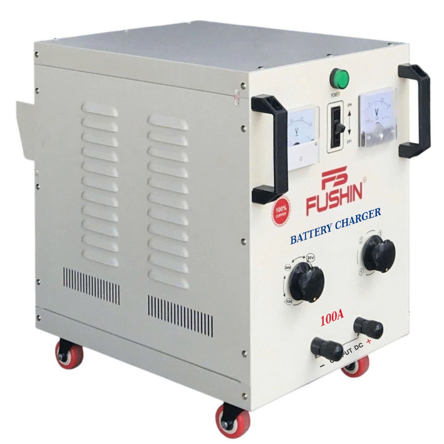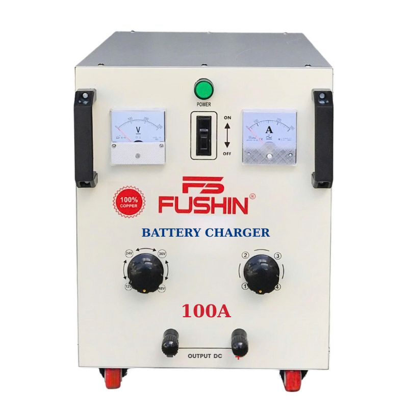 - Máy sạc bình ắc quy tăng giảm 100A Fushin được chế tạo để nạp điện cho các loại bình ắc quy khí, nước, khô. Đặc biệt là bình ắc quy của xe máy, xe nâng, xe ô tô,....