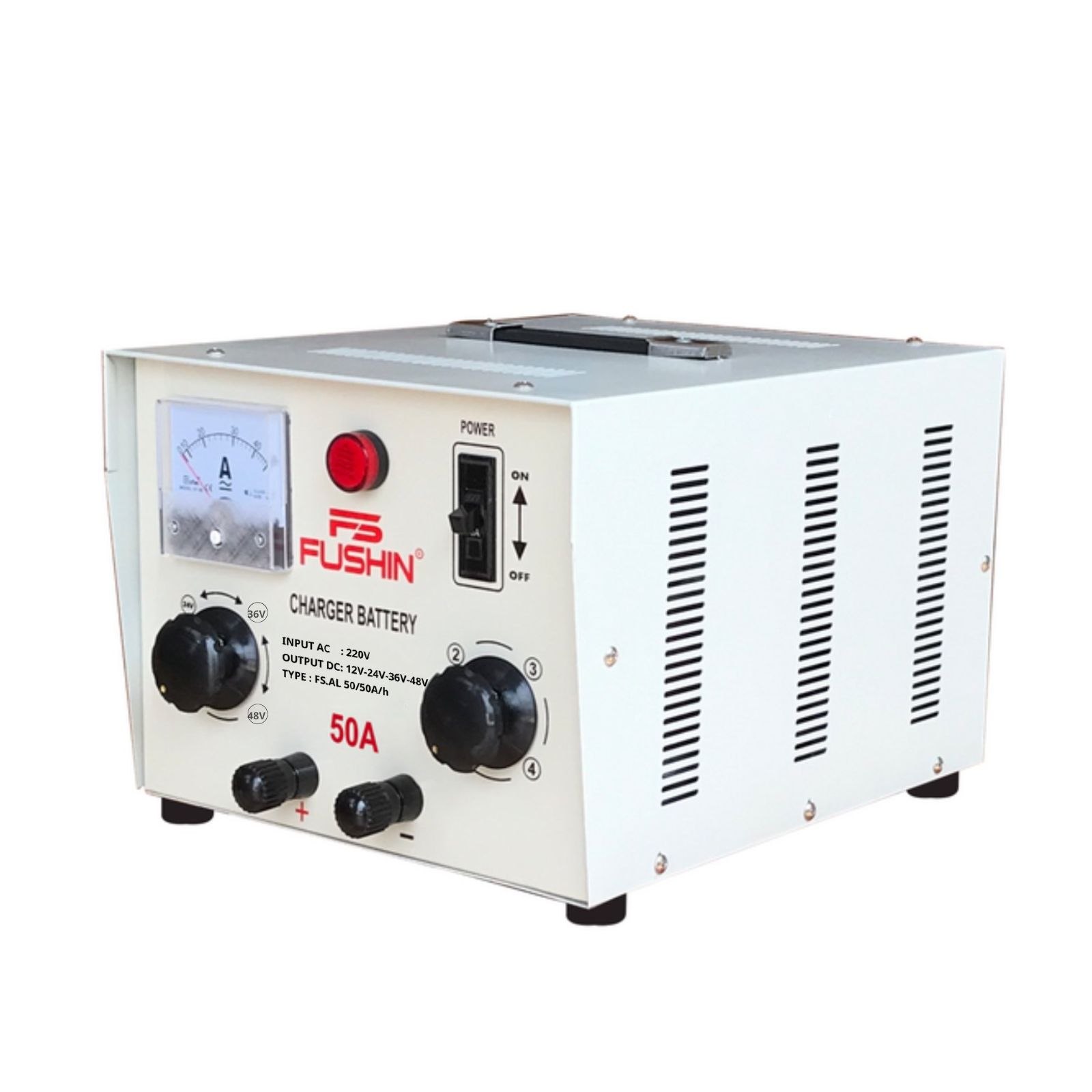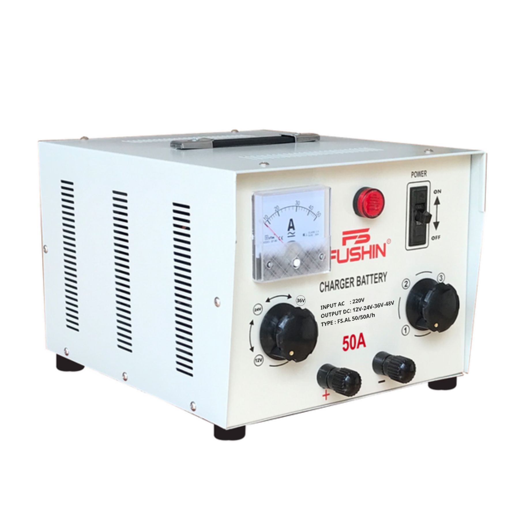 - Máy sạc bình ắc quy tăng giảm 50A Fushin được chế tạo để nạp điện cho các loại bình ắc quy khí, nước, khô. Đặc biệt là bình ắc quy của xe máy, xe nâng, xe ô tô,....