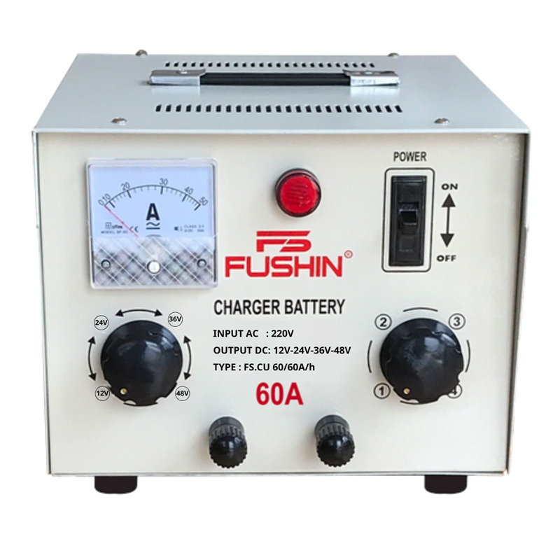 - Máy sạc bình ắc quy tăng giảm 60A Fushin được chế tạo để nạp điện cho các loại bình ắc quy khí, nước, khô. Đặc biệt là bình ắc quy của xe máy, xe nâng, xe ô tô,....