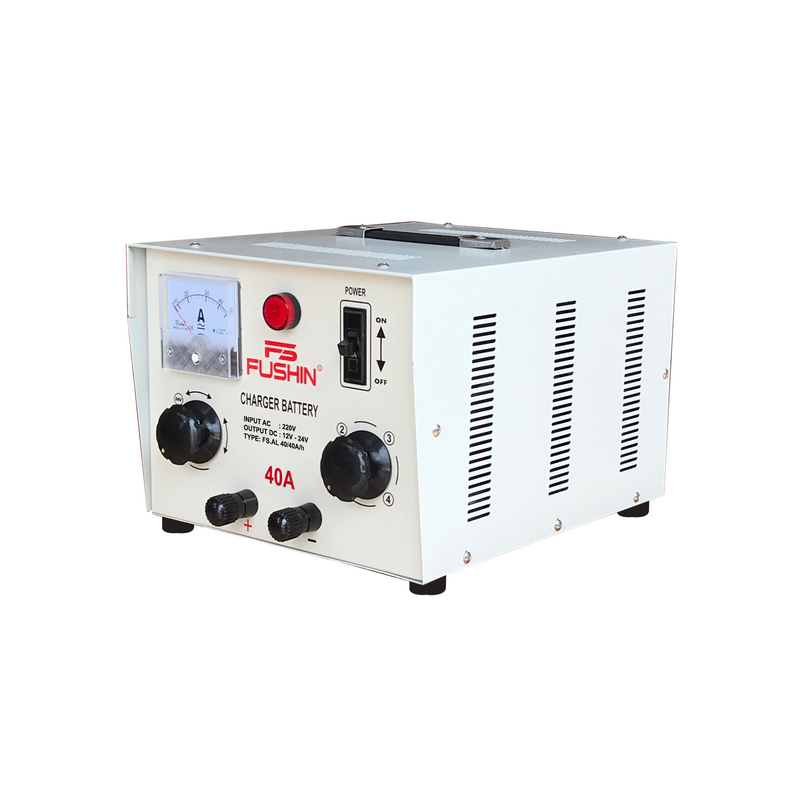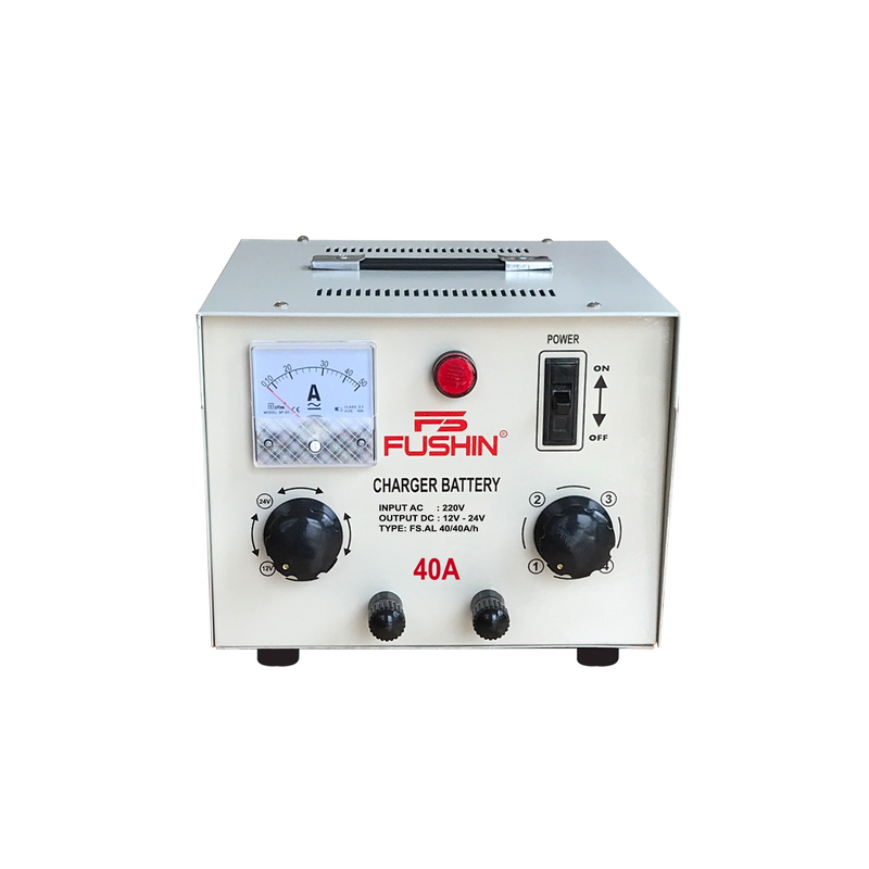 - Máy sạc bình ắc quy tăng giảm 40A Fushin được chế tạo để nạp điện cho các loại bình ắc quy khí, nước, khô. Đặc biệt là bình ắc quy của xe máy, xe nâng, xe ô tô,....