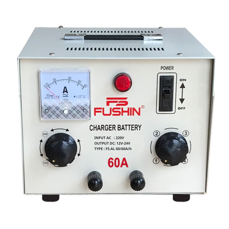 - Máy sạc bình ắc quy tăng giảm 60A Fushin được chế tạo để nạp điện cho các loại bình ắc quy khí, nước, khô. Đặc biệt là bình ắc quy của xe máy, xe nâng, xe ô tô,....