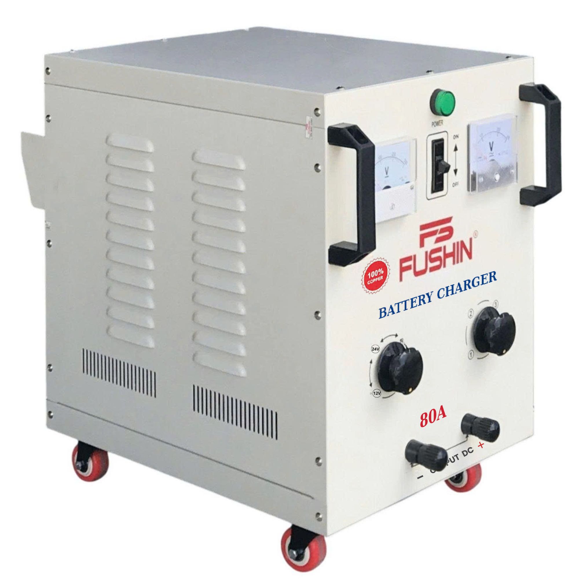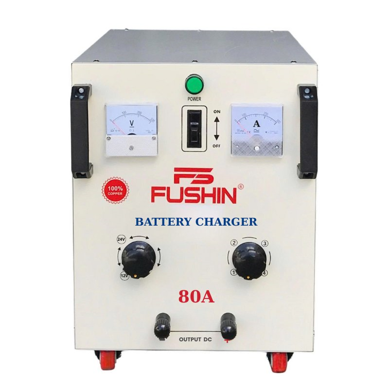 - Máy sạc bình ắc quy tăng giảm 80A Fushin được chế tạo để nạp điện cho các loại bình ắc quy khí, nước, khô. Đặc biệt là bình ắc quy của xe máy, xe nâng, xe ô tô,....