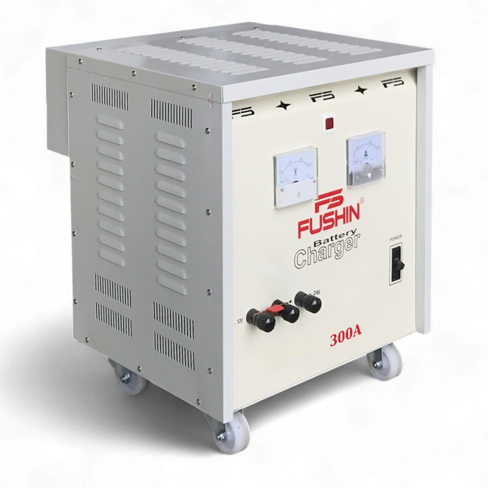 - Máy sạc bình ắc quy tăng giảm cơ 300A Fushin được chế tạo để nạp điện cho các loại bình ắc quy khí, nước, khô. Đặc biệt là bình ắc quy của xe máy, xe nâng, xe ô tô,....