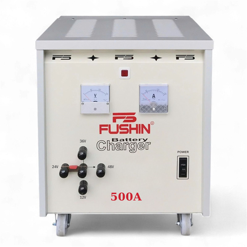 - Máy sạc bình ắc quy tăng giảm cơ 500A Fushin được chế tạo để nạp điện cho các loại bình ắc quy khí, nước, khô. Đặc biệt là bình ắc quy của xe máy, xe nâng, xe ô tô,....