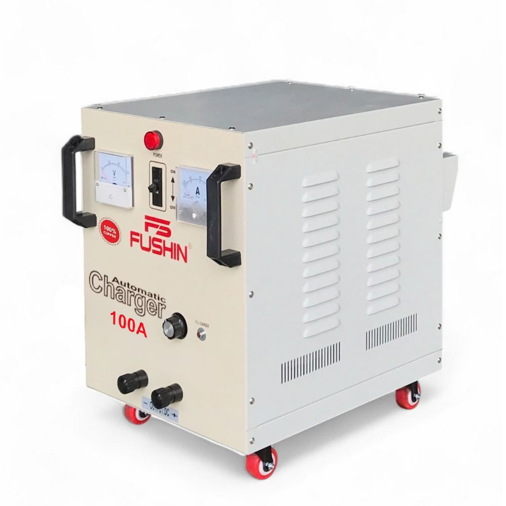 - Máy sạc bình ắc quy 100A Fushin được chế tạo để nạp điện cho các loại bình ắc quy khí, nước, khô. Đặc biệt là bình ắc quy của xe máy, xe nâng, xe ô tô,....