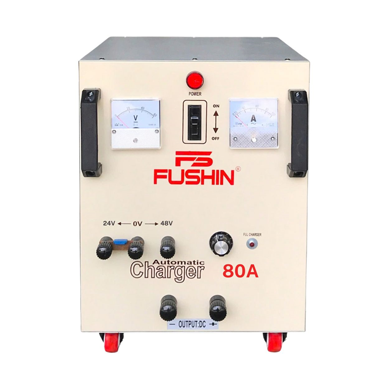 - Máy sạc bình ắc quy 80A Fushin được chế tạo để nạp điện cho các loại bình ắc quy khí, nước, khô. Đặc biệt là bình ắc quy của xe máy, xe nâng, xe ô tô,....